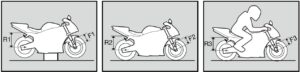 Καθόμαστε πάνω στη μηχανή μας με πλήρη εξάρτηση (κράνος, μπουφάν κλπ) και πατώντας πολύ ελαφριά στο έδαφος ή με τη βοήθεια ενός άλλου ατόμου ίσα να ισορροπεί η μηχανή και ξανακάνουμε πάλι τις ίδιες μετρήσεις R3,F3).